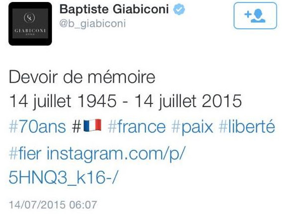 Le 14 juillet 2015, disais-je, le mannequin-chanteur Baptiste Giabiconi avait tweeté :